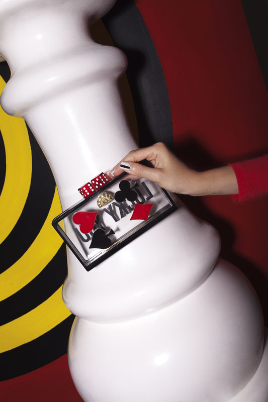 Black and Gold acrylic round clutch with acrylic details of heart and trevol poker chip on front.
