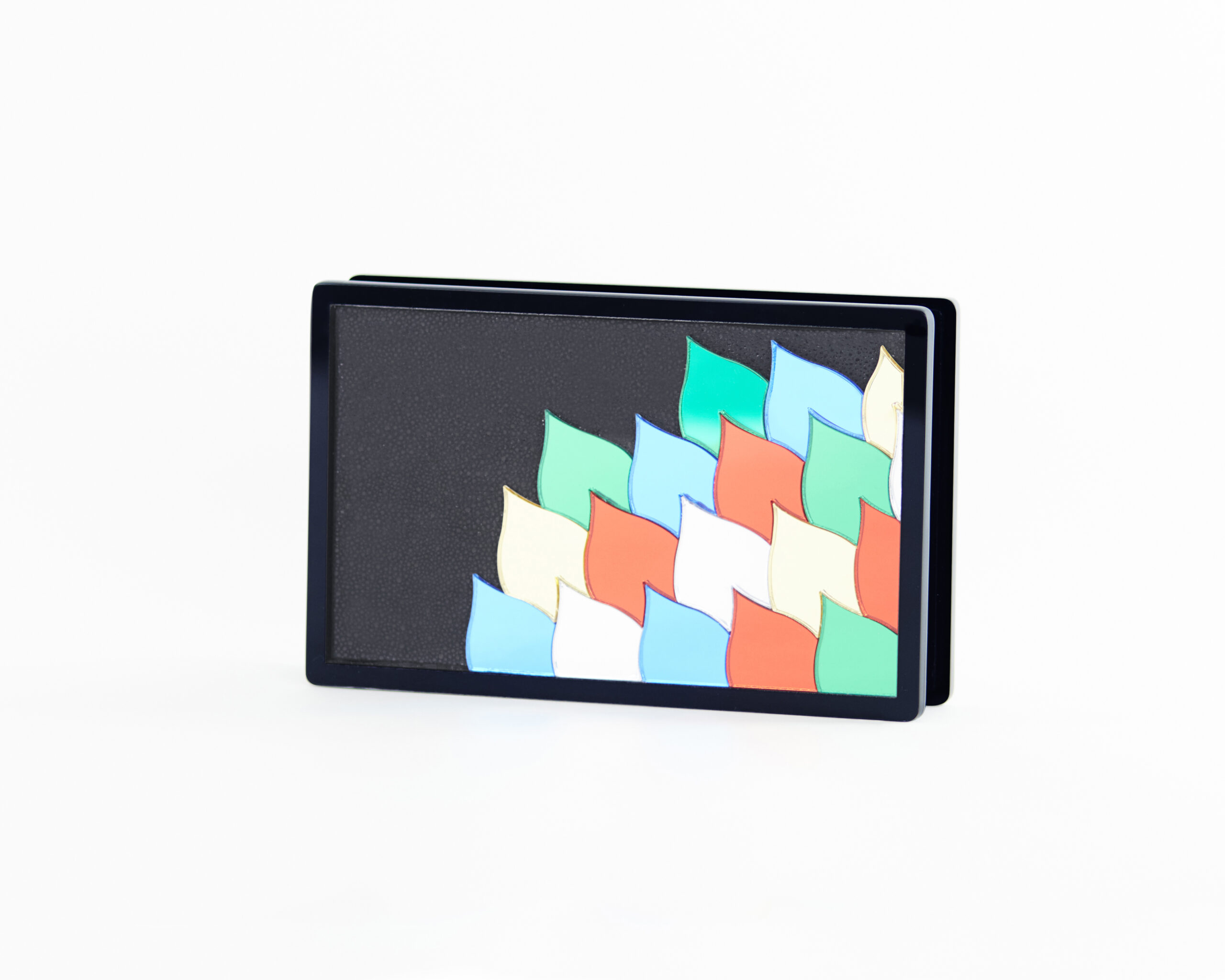 Rectangle shaped clutch with black acrylic surrounding, black textured leather backdrop with details in multicolor mirror acrylic.